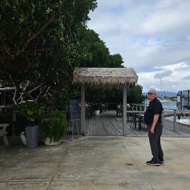 Steve at the entrance of a restaurant on the water in Salinas